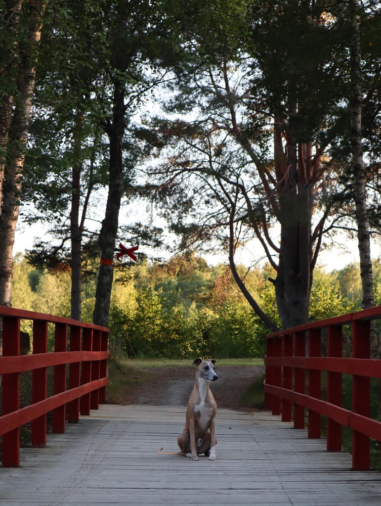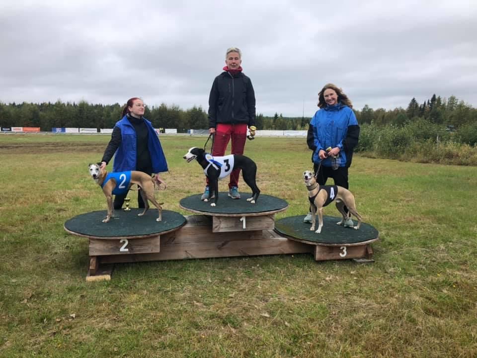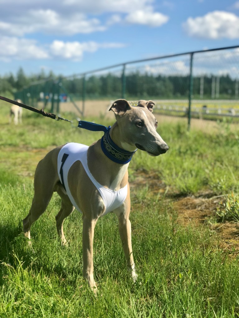 Men så kom dagen då vi, tillsammans med grannen Laila Stenlund och hennes Whippet Sigge, provade på kapplöpning på rundbanan i Boviken, Skellefteå. Det blev omedelbart