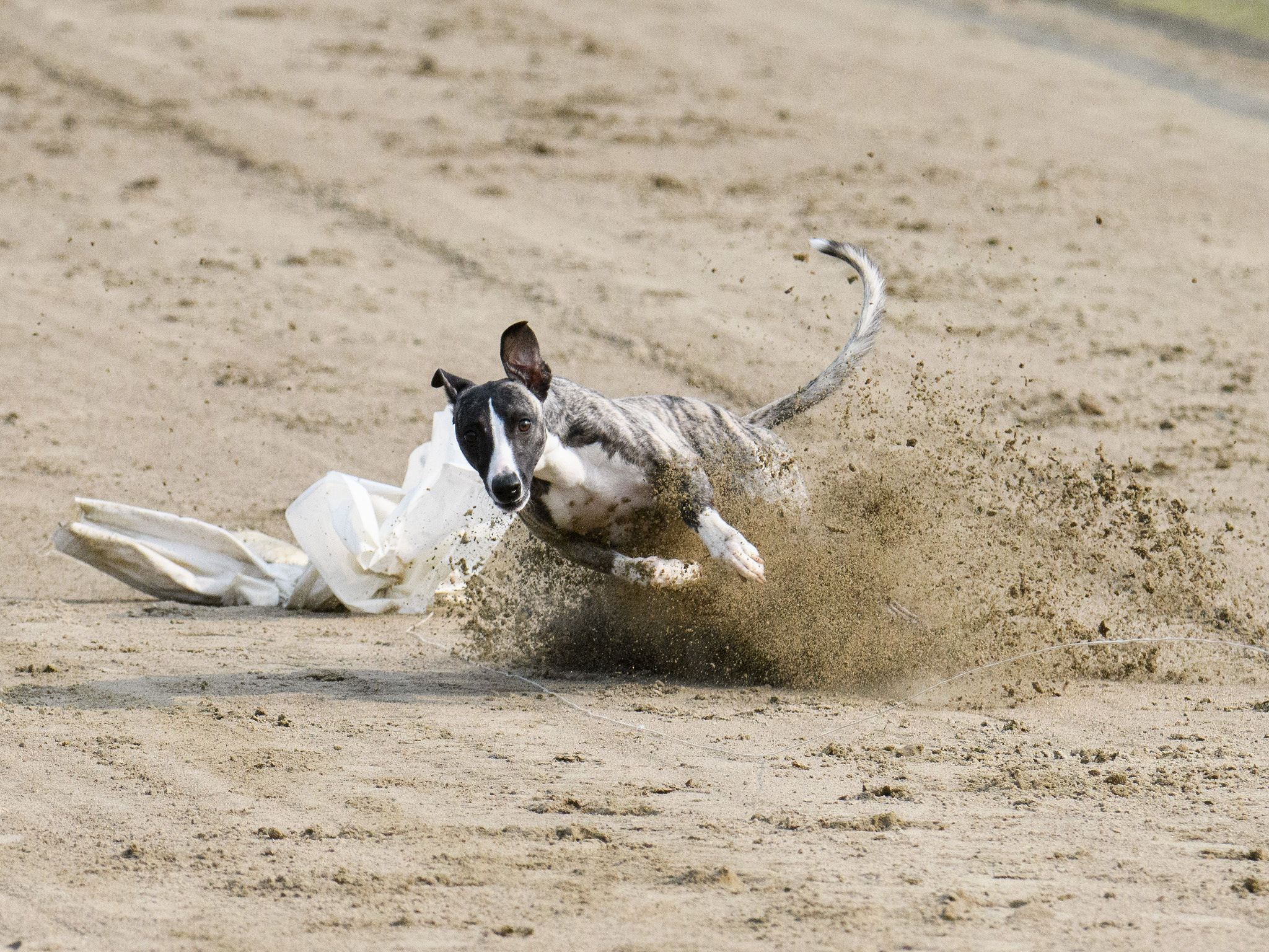 För att få springa efter en mekanisk hare på banan måste hunden vara 12 månader. Vid ca 5-9 månader får man försiktigt börja testa sin valp efter släphare längs raksträckan på banan. Det är en hare/plastpåse som sitter fast i ett långt snöre och som dras in med hjälp av en liten maskin som spinner in snöret. Hundarna springer rakt fram efter släpharen, och de tycker det är jättekul!